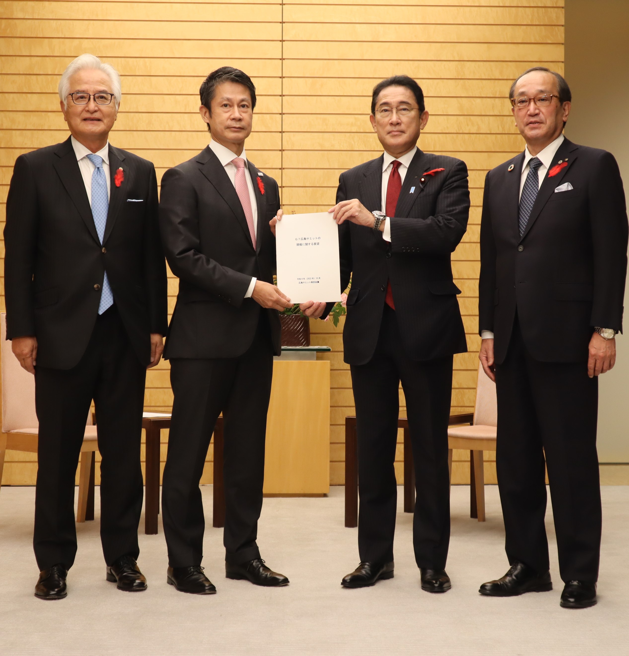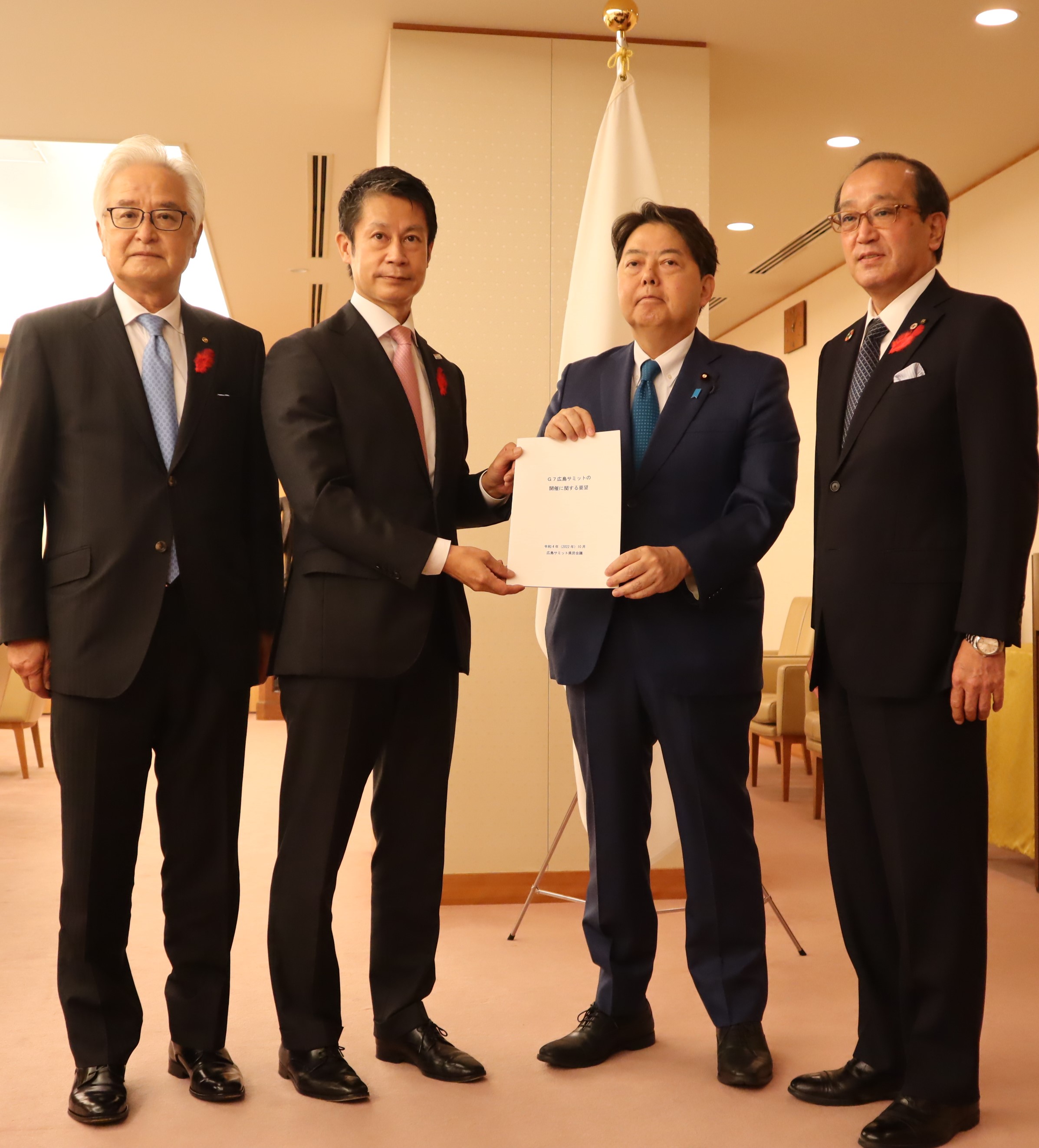 広島サミット県民会議(会長:広島県知事、副会長:広島市長、広島県商工会議所連合会会頭)では、去る10月5日、湯﨑英彦広島県知事、松井一實広島市長、池田晃治広島県商工会議所連合会会頭の3者にて、首相官邸及び外務省を訪問し、岸田文雄内閣総理大臣、林芳正外務大臣に対して、G7広島サミットの開催に関する要望を行いました。